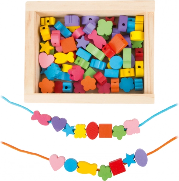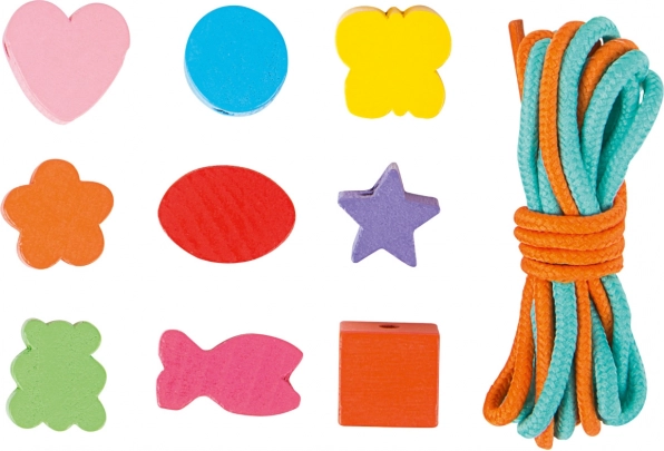 I piccoli creatori possono godere di ore di divertimento con questo set in legno. La scatola contiene 81 perline colorate e 2 lacci, che permettono ai bambini di creare gioielli variati secondo le loro idee.