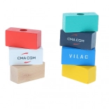 I container in legno colorati si possono facilmente inserire e riorganizzare – giocando, i bambini apprendono classificazione, logica e coordinazione dei movimenti.