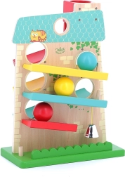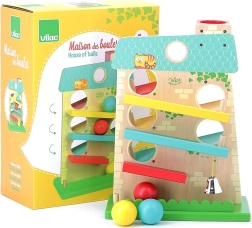 Scoprite la magia del movimento e del suono con la casetta a cascata VILAC. Grazie a una struttura ben studiata, le palline scorrono fluidamente da un lato all’altro lungo tre rampe e terminano con il tintinnio di un campanellino in metallo, tanto amato dai bambini. La solida lavorazione in legno e metallo assicura lunga durata e gioco in sicurezza.