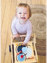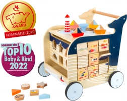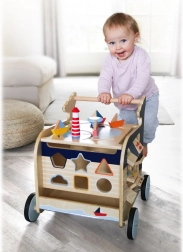 Esplorate con il girello in legno a forma di balena. Questo girello non solo aiuta i bambini nei primi passi, ma fornisce anche vari giocattoli interattivi che supportano lo sviluppo motorio.