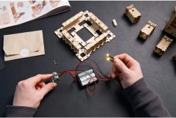 Il set include 340 pezzi in legno tagliati con precisione e un manuale dettagliato. Il montaggio è alla portata anche dei principianti più abili, pur offrendo una sfida adeguata ai più esperti. L'alimentazione può avvenire tramite USB‑C oppure 3× AA (non incluse nella confezione), così potrai integrare facilmente il modello in qualsiasi ambiente.