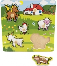 Il puzzle aiuta i bambini a conoscere vari animali domestici, come il cavallo, la capra, la pecora, la gallina e la mucca. Ognuno di essi ha una forma e un colore unici.