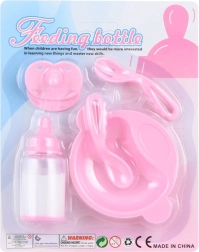 Set di accessori per bambole ideale per i giochi di mamma, comprende biberon, ciuccio, piattino e posate. Un complemento perfetto per ogni piccola assistente.