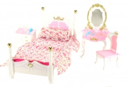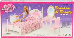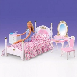 La Glorie Camera da Letto include: un letto in plastica di circa 16 cm x 34 cm x 18 cm con copriletto e cuscino; un tavolino da toeletta di circa 13 cm x 8 cm x 22 cm con accessori per bambole – pettinino, braccialetto, spazzola e boccette; una poltrona di circa 7 cm x 7 cm x 13 cm; un comodino di circa 8,5 cm x 6 cm x 8 cm. La bambola non è inclusa nella confezione. Età 3+.