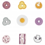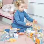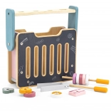 C'è tutto il necessario per le prime ricette: due pentolini e utensili di base (coltello, cucchiaio, spatola, pinze), spiedini e alimenti in legno come carne, uova e verdure. I colori vivaci invitano al gioco e sostengono il ruolo del piccolo chef.