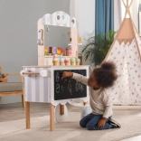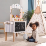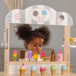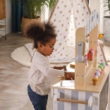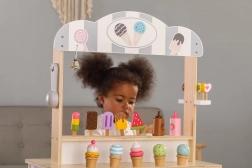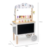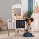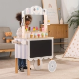 Questo chiosco in legno funziona come negozio, pasticceria o chiosco di gelati. I bambini possono giocare al loro scenario preferito grazie ai numerosi accessori come lecca-lecca, gelati, cialde e topping. Un'eccellente aggiunta è la lavagna per scrivere o disegnare il menù del giorno. L'intero set è dipinto con colori atossici in tonalità delicate, che attirano l'attenzione dei bambini.