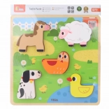 Questo adorabile puzzle in legno a tema fattoria include 5 pezzi robusti: cavallino, pecorella, gallinella, cagnolino e paperella. I bambini inseriscono gli animali nelle sagome corrispondenti sulla base colorata, allenando il riconoscimento delle forme e la memoria visiva.