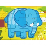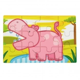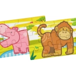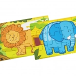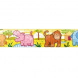 Forme semplici e colori vivaci di leone, elefante, ippopotamo e scimmietta motivano i bambini a comporre e stimolano la percezione visiva.