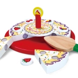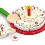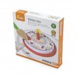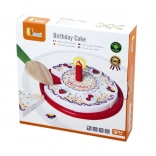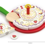 La torta di compleanno in legno su vassoio è suddivisa in spicchi con decorazioni e candela. Grazie al velcro/magneti (a seconda della versione) i pezzi si separano e si ricompongono facilmente. I bambini esercitano la presa, la precisione e il vocabolario durante il gioco condiviso del “soffiare la candela” e del servire.