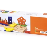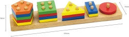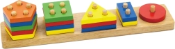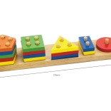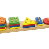 Questo robusto puzzle in legno combina la classificazione e l’infilatura delle forme sui pioli. I bambini imparano a distinguere colori e forme geometriche, esercitano la coordinazione occhio–mano e migliorano la destrezza nella manipolazione dei pezzi. Il legno è levigato con cura e i colori sono vivaci e attraenti.