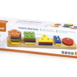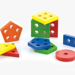 Il set include pezzi geometrici dai colori vivaci, che i bambini possono afferrare facilmente e ordinare per forma e colore.