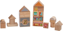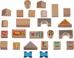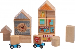 Costruisci il tuo pittoresco paesino con blocchi di legno accuratamente rifiniti e parti per un giro con due piccole macchinine. I pezzi di forme diverse – parallelepipedi, triangoli, cilindri e ponticelli – si combinano alla perfezione e invogliano i bambini alla costruzione creativa e al gioco libero.