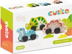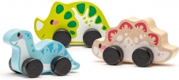 Il set include tre dinosauri in legno con ruote per un facile movimento, ideali per i più piccoli.