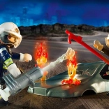 Include tutte le attrezzature di base per gli esercizi antincendio, incluse figurine di pompieri, un'auto in fiamme e gli accessori necessari.