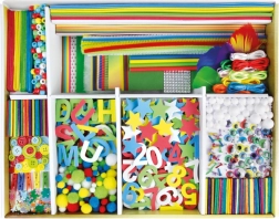 • Contenuto ricco: pellicola e carta trasparente, cartone ondulato, feltro, pile, pezzi in gommapiuma, gemme adesive, mollette da bucato, bastoncini di legno, piume, nastro crespo, bottoni e altro.
