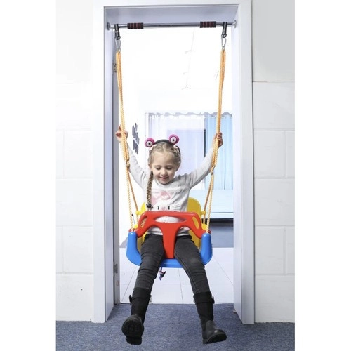 Il montaggio è rapido e semplice: appendi l’altalena al balcone, al telaio della porta (ad es. a una barra estensibile) o a una struttura da giardino. Le corde in nylon regolabili permettono una precisa regolazione dell’altezza. I componenti plastici in PP e gli elementi metallici garantiscono lunga durata per uso domestico sia in interni che in esterni.