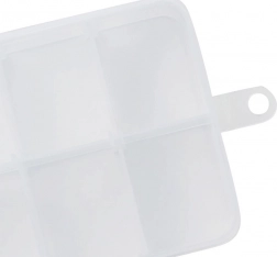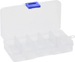 La soluzione modulare permette di configurare da un minimo di 4 a un massimo di 10 scomparti: basta rimuovere o inserire i divisori. Il design trasparente offre una rapida panoramica del contenuto, mentre la clip a presa salda mantiene il coperchio ben chiuso durante il trasporto.