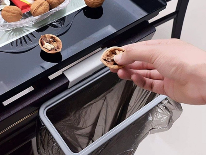 Pratico portasacco sospeso per rifiuti per cucina, bagno e garage. Grazie all’ingegnoso supporto si fissa facilmente all’anta o al cassetto. Il coperchio ermetico trattiene gli odori all’interno mantenendo la casa pulita. Installazione rapida, uso universale e dimensioni compatte lo rendono una soluzione ideale per la raccolta differenziata e per riporre piccoli oggetti.
