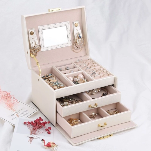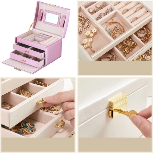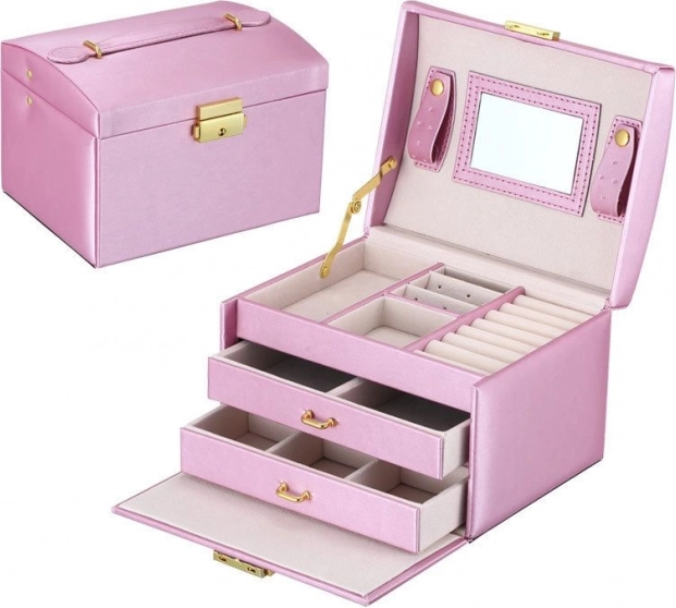 Onder de persoonlijke bezittingen van elke vrouw spelen sieraden een belangrijke rol. De meerlagige sieradenkist is een onmisbaar en betrouwbaar product voor het opbergen van uw kostbaarheden. De afzonderlijke vakken en lades bieden perfecte opbergruimte voor oorbellen, armbanden, horloges, kettingen, brillen en andere kostbaarheden. De sieradendoos lost het probleem op van in elkaar verstrengelde kettingen, schuren en krassen. Gouden, zilveren en kunstsieraden kunt u apart sorteren. De zachte voering beschermt uw kostbare sieraden tegen krassen. De sieradendoos heeft een grote afneembare spiegel, die geschikt is voor het passen van sieraden en voor het opmaken.