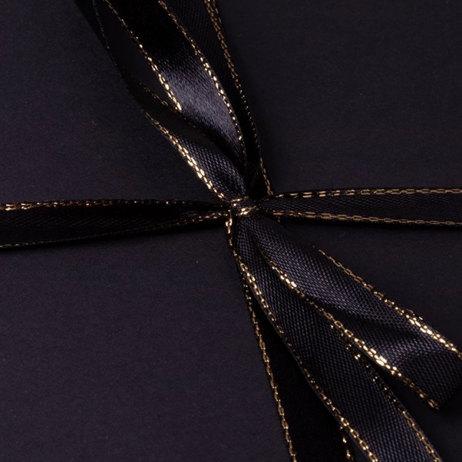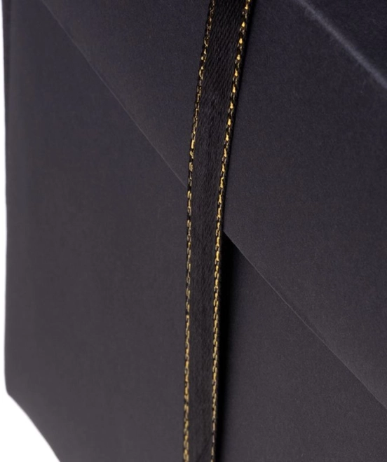 Doosje met zwarte strik en gouden stiksel, geschikt voor een elegante cadeaupresentatie.