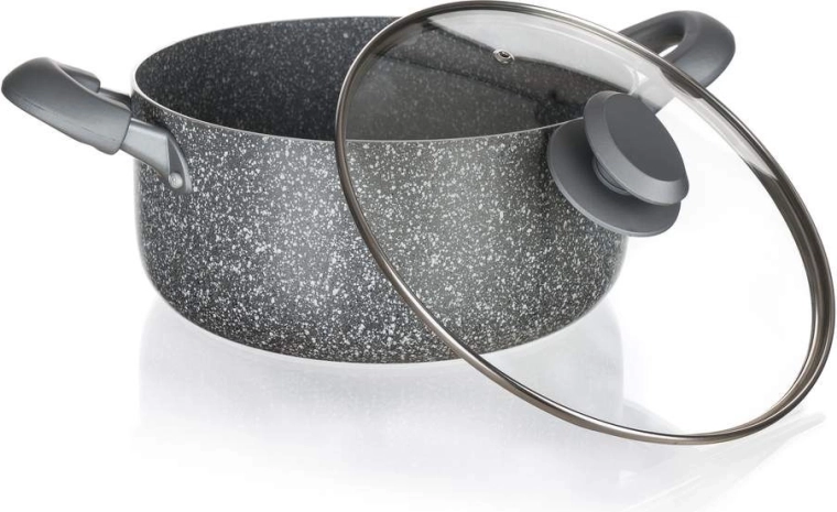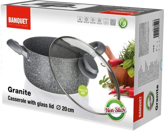 De BANQUET GRANITE pan combineert modern design met hoge functionaliteit. De body van geperst aluminium zorgt voor een snelle en gelijkmatige warmteverdeling, terwijl de twee‑laagse antiaanbaklaag met graniet‑effect aanbranden minimaliseert en het onderhoud vereenvoudigt. Het glazen deksel maakt controle tijdens het koken mogelijk zonder onnodig warmteverlies.