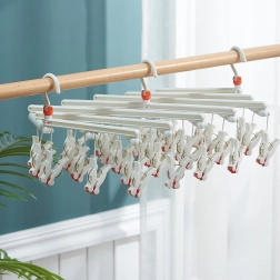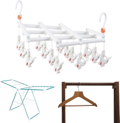 Praktisch opvouwbaar droogrek met 14 wasknijpers, ideaal voor het drogen van sokken, ondergoed en kleine stukken was, zowel binnen als buiten. Dankzij de draaibare haak en de compacte afmetingen bespaart het ruimte en is het gemakkelijk in gebruik. Duurzame kunststof, veilige wasknijpers tegen wegglijden en een opvouwbare constructie voor eenvoudig opbergen maken dit droogrek tot een geweldige hulp in elk huishouden.