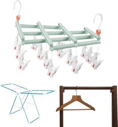 De duurzame kunststof is vochtbestendig en snel drogend, dus geschikt voor balkon, badkamer en onderweg. Het opvouwbare design bespaart ruimte bij het opbergen en de ergonomische clips met antislip beschermen stoffen tegen beschadiging.
