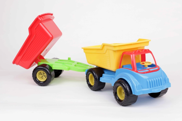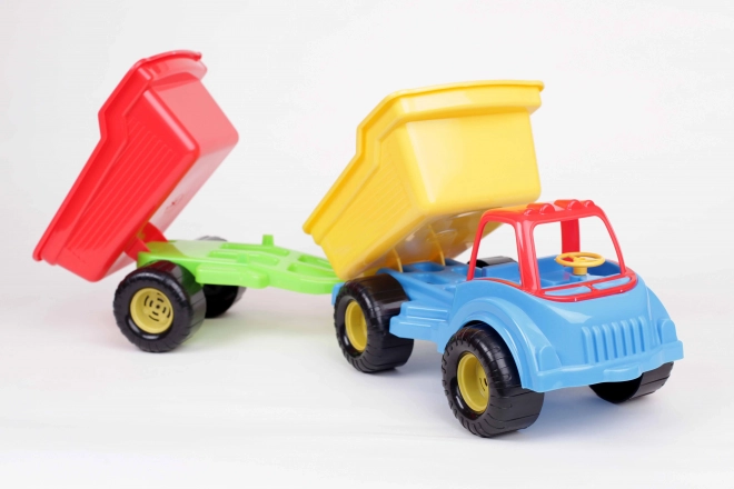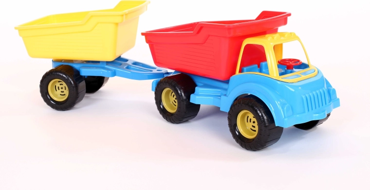 Sambood kiepauto met torsie-aanhanger; de kiepwagen is ideaal om mee te spelen in de zandbak of op het strand. Het is geweldig vermaak voor kleine bouwers, omdat zowel de auto als de aanhanger het vervoer van goederen en zand mogelijk maken. De aanhanger kan worden losgekoppeld.