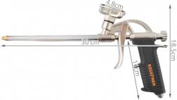 Betrouwbaar PU-schuimpistool voor montage, afdichting en isolatie. De robuuste metalen constructie garandeert een lange levensduur en stabiliteit tijdens het werk, terwijl de ergonomische kunststof handgreep zorgt voor een zekere grip en comfort, ook bij langdurig gebruik. Dankzij de lange spuitmond bereik je eenvoudig voegen en krappe ruimtes.