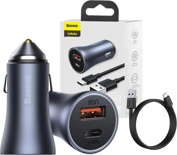 De snelle autolader BASEUS Golden Contactor Pro biedt een vermogen van 40 W, twee poorten USB‑A en USB‑C en ondersteuning voor Power Delivery, Quick Charge 4.0+ en SCP. Dankzij 7 niveaus van beveiliging, een compact metalen huis en de USB–USB‑C-kabel van 1 m in de verpakking laad je telefoon en tablet veilig op tijdens elke rit.