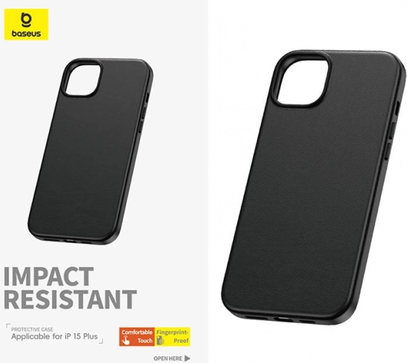 Deze dunne en stijlvolle Baseus Fauxther Series-hoes voor de iPhone 15 Plus in het zwart biedt valbestendigheid en beschermt je telefoon tegen beschadigingen. Gemaakt van hoogwaardige PU‑leer die vlekbestendig is.