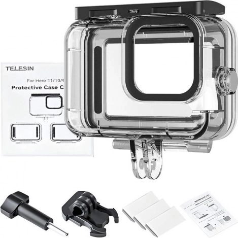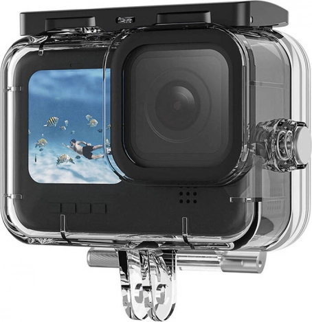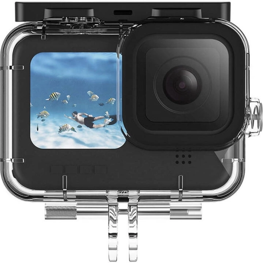 De waterdichte hoes voor GoPro Hero camera’s model 12, 11, 10 en 9 maakt zorgeloze onderwateropnames mogelijk tot een diepte van 45 meter. Dankzij het geharde glas met hoge lichtdoorlaatbaarheid behaalt u uitstekende beeldresultaten met levendige kleuren. In de verpakking zitten antimist‑inserts die effectief condensvorming binnenin de hoes voorkomen.