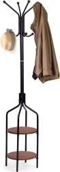 Het bovenste deel heeft vier armen, die 8 plekken om kleding op te hangen bieden. Het onderste deel is uitgerust met twee functionele planken in rustiek bruin. De constructie is gemaakt van poedergecoat metaal en de basis van 4 verbrede pootjes, die stabiliteit zelfs bij zware belasting garanderen. Elk pootje is afgewerkt met een dop die uw vloer tegen krassen beschermt.