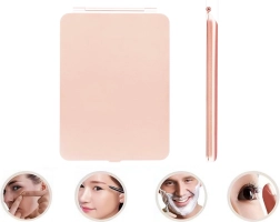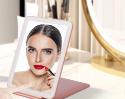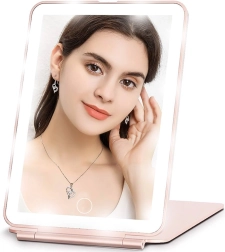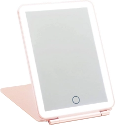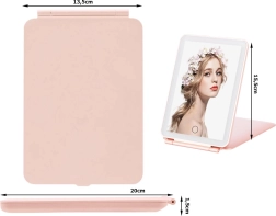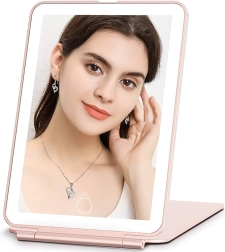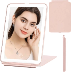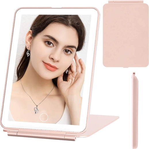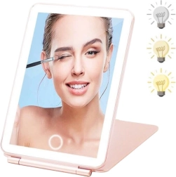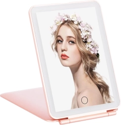 Elegante opvouwbare make-upspiegel met geïntegreerde LED-verlichting voor perfect opmaken, waar je ook bent. Biedt warm, koud en gemengd licht, touchbediening voor helderheid en kleur en een oplaadbare batterij voor comfortabel gebruik thuis en onderweg.