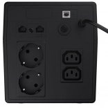 Twee Schuko-stopcontacten en twee IEC-uitgangen dekken verschillende apparaten, USB maakt beheer vanaf de pc mogelijk en RJ45 IN/OUT beschermt netwerkverbinding en communicatie.