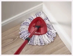 De driehoekige mopkop maakt het gemakkelijk om hoeken schoon te maken en de zwenkkop vergemakkelijkt het schoonmaken van moeilijk bereikbare plaatsen onder meubels.