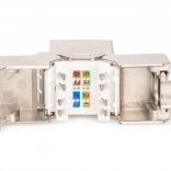 De stalen Cat 8.1 keystone-module is ontworpen voor extreem snelle en betrouwbare ethernetverbindingen. Volledige 360°-afscherming minimaliseert storingen en zorgt voor stabiele prestaties, ook in veeleisende omgevingen. Dankzij het compacte ontwerp past hij in 1U‑panelen (19", 483 mm) en maakt hij tot 24 poorten mogelijk.