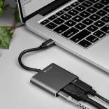 Veelzijdig gebruik: De Tracer A-1 is een multifunctionele adapter die de connectiviteit van uw computer of laptop verbetert. Het is uitgerust met een USB-C-aansluiting en drie poorten waarmee je tegelijkertijd extra compatibele apparaten kunt aansluiten en bedienen. De USB 3.0-poort maakt gebruik van handige randapparatuur mogelijk, zoals een extern toetsenbord of muis, en stelt je in staat snel gegevens over te dragen tot 5 Gbps. Met de HDMI 1.4-poort kun je een extra monitor of projector aansluiten, zodat je comfortabeler kunt werken op een groter scherm. Deze standaard ondersteunt 4K-kwaliteit, wat betekent dat het kijken naar films of het spelen van je favoriete spel nog aangenamer zal zijn. De derde poort zorgt voor snel opladen van nieuwe iPhones, iPads, MacBooks en andere compatibele apparaten die via USB-C worden gevoed.