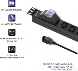 Stabiele en veilige stroomvoorziening voor uw apparatuur. Voorzie uw netwerkapparatuur in de rackkast van bescherming tegen overspanning en stroomuitval met de PDU-stekkerdoos van Qoltec.