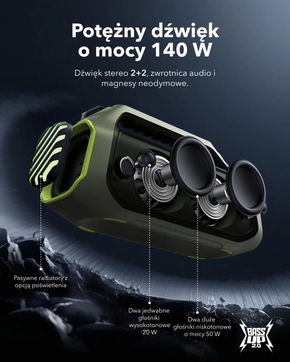 De Soundcore Boom 2 Plus is gemaakt voor outdoorplezier: hij levert helder en luid stereogeluid met uitgesproken detailweergave dankzij titanium drivers met een frequentierespons tot 40 kHz. De exclusieve BassUp analyseert muziek in real time en versterkt de lage frequenties voor echt krachtige bassen zonder vervorming.
