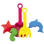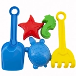 De schep, het harkje en drie vormpjes bieden kinderen eindeloze mogelijkheden om zandtaartjes en zandbouwwerken te maken.