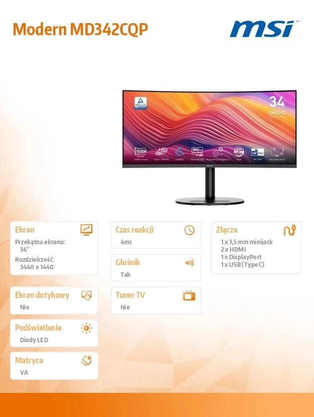 De Modern MD342CQP tilt productiviteit en entertainment naar een hoger niveau. Dankzij de UWQHD-resolutie op een 34"-diagonaal heb je meer ruimte voor apps, tijdlijnen en zijpanelen. De kromming van het display trekt je in de actie en verbetert het perifere zicht, of je nu foto’s bewerkt, video monteert of in games opgaat.