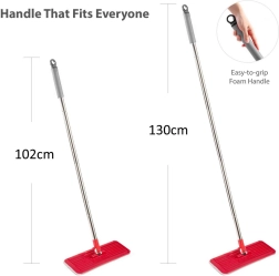 De lichte en verstelbare steel maakt schoonmaken van grote oppervlakken en hoge ramen eenvoudig. De ultraplatte kop met draaibare kop zorgt voor nauwkeurige reiniging onder banken, kasten en rond meubelpoten. De set bevat 2 reserve microvezelhoezen voor een lange levensduur en hygiënisch gebruik.