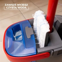 De praktische emmer met ergonomisch handvat maakt dragen, legen en uitspoelen van de mop gemakkelijk, terwijl de gescheiden kamers voor netheid zorgen.