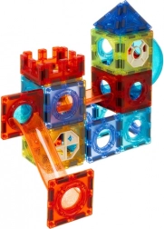 Magnetische blokken en baanelementen van duurzaam ABS-kunststof hechten dankzij sterke magneten eenvoudig en stabiel aan elkaar. Kinderen kunnen platte en ruimtelijke constructies bouwen, torens, bruggen en vooral creatieve knikkerbanen met tunnels, bochten en schalen. Transparante kleuren ondersteunen de waarneming van vormen en kleuren en nodigen uit om te ontdekken.