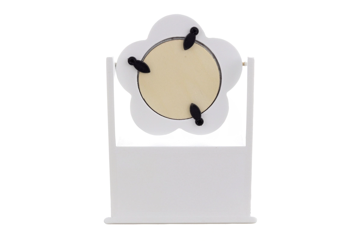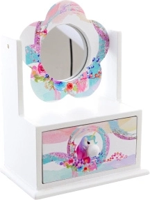 Dit charmante houten sieradendoosje met een bloemvormig spiegeltje zal elke kleine diva blij maken. Dankzij het schattige ontwerp met een eenhoorn is het niet alleen een mooie decoratie, maar ook een praktische plek om kleine sieraden en schatten in op te bergen.