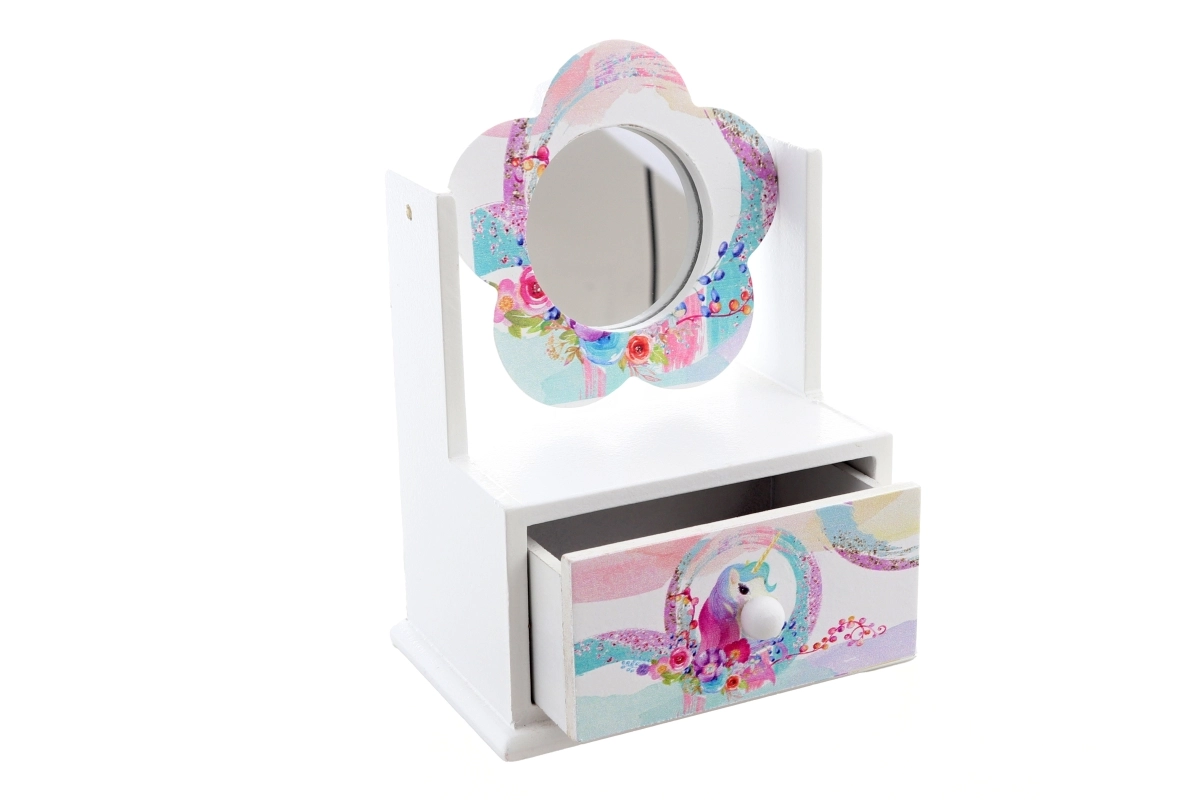 Het uittrekbare laadje met een eenhoornmotief houdt ringen, oorbellen en andere kleinigheden overzichtelijk en binnen handbereik.
