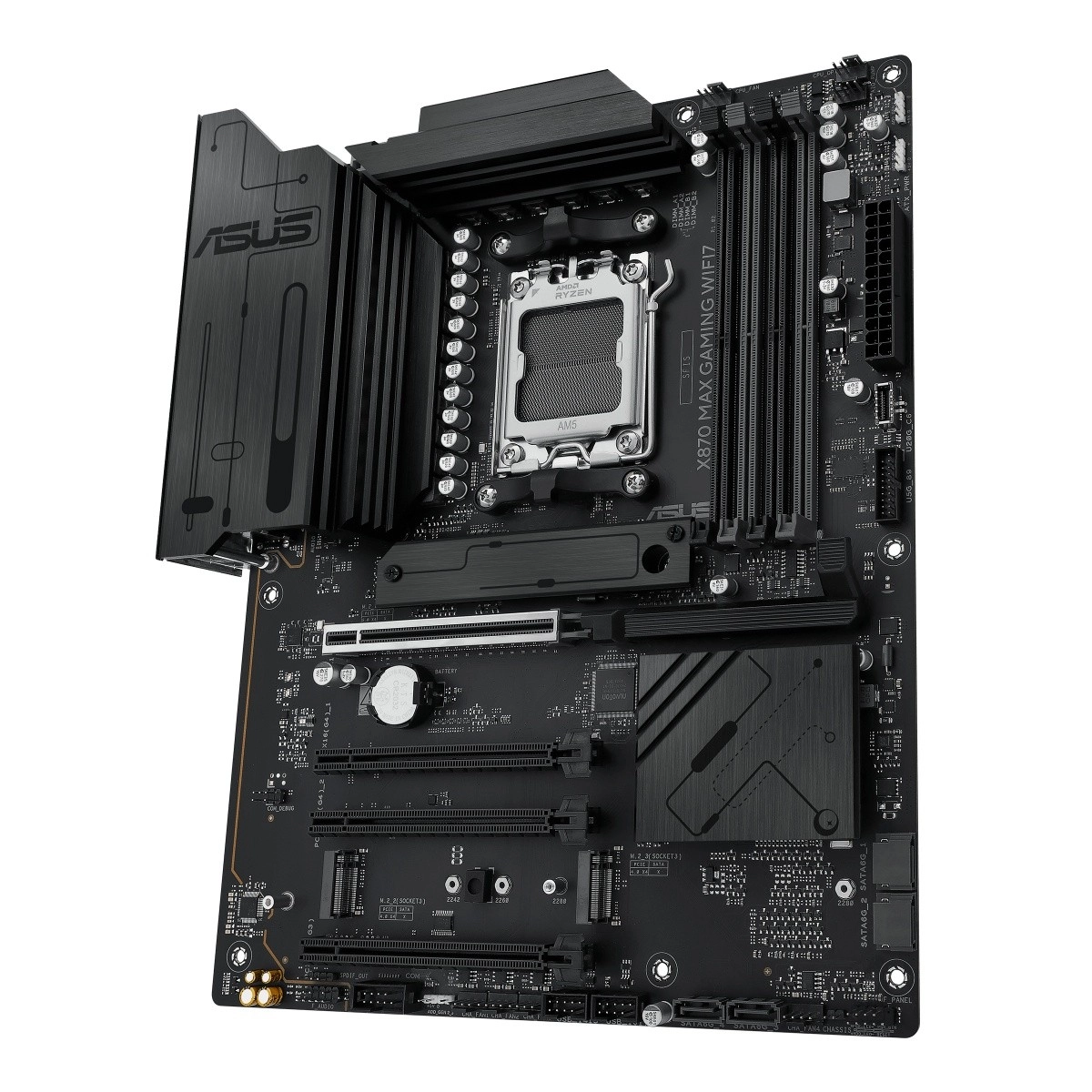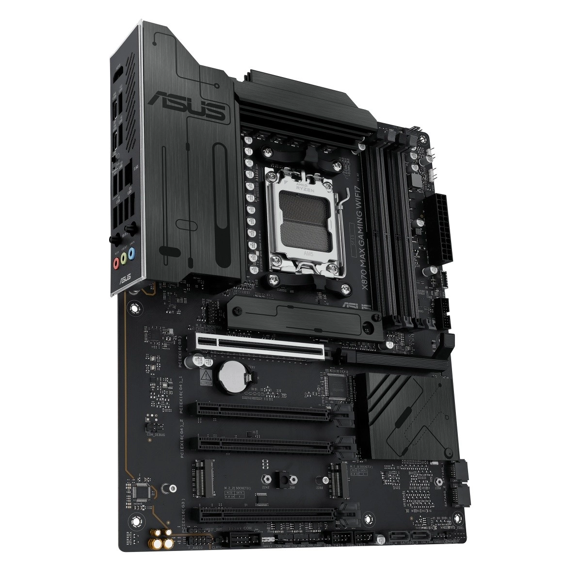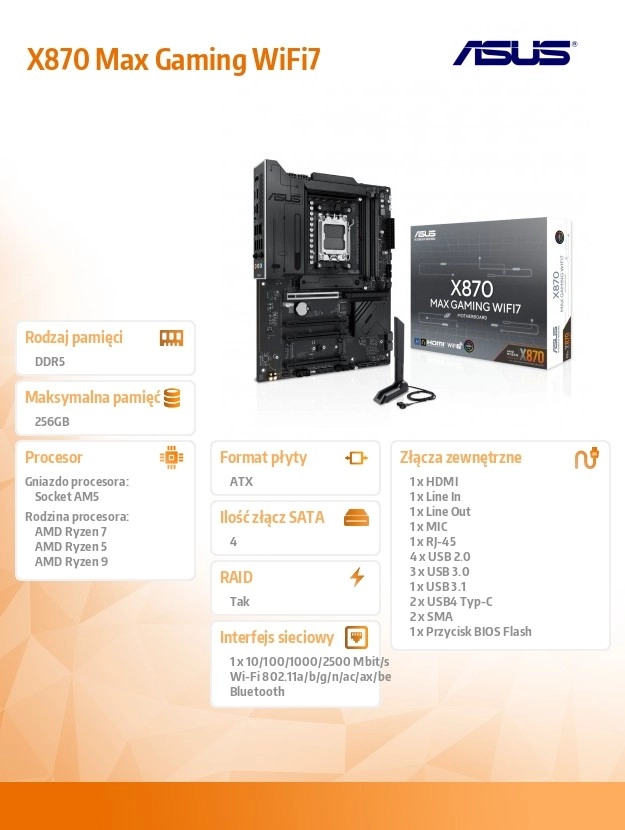 De ASUS X870 Max Gaming WiFi 7 is een high-end gamingmoederbord voor het AM5-platform dat het volledige potentieel van AMD Ryzen 9000-processors ontgrendelt. Het combineert een stabiele vermogensregeling, massieve VRM- en M.2-heatsinks met moderne connectiviteit, waaronder Wi‑Fi 7 en USB‑C, om snelheid, stabiliteit en bandbreedte te leveren voor gaming, contentcreatie en AI-workflows.