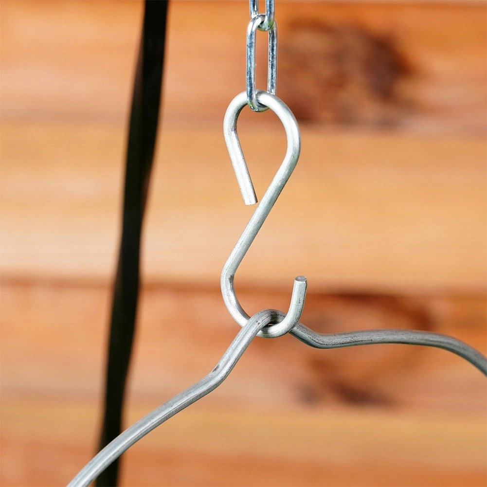 De robuuste ophangbeugel en de rondom aangebrachte draadversterking van de rand zorgen voor stabiliteit bij het ophangen aan een driepoot en voor gemakkelijk dragen.