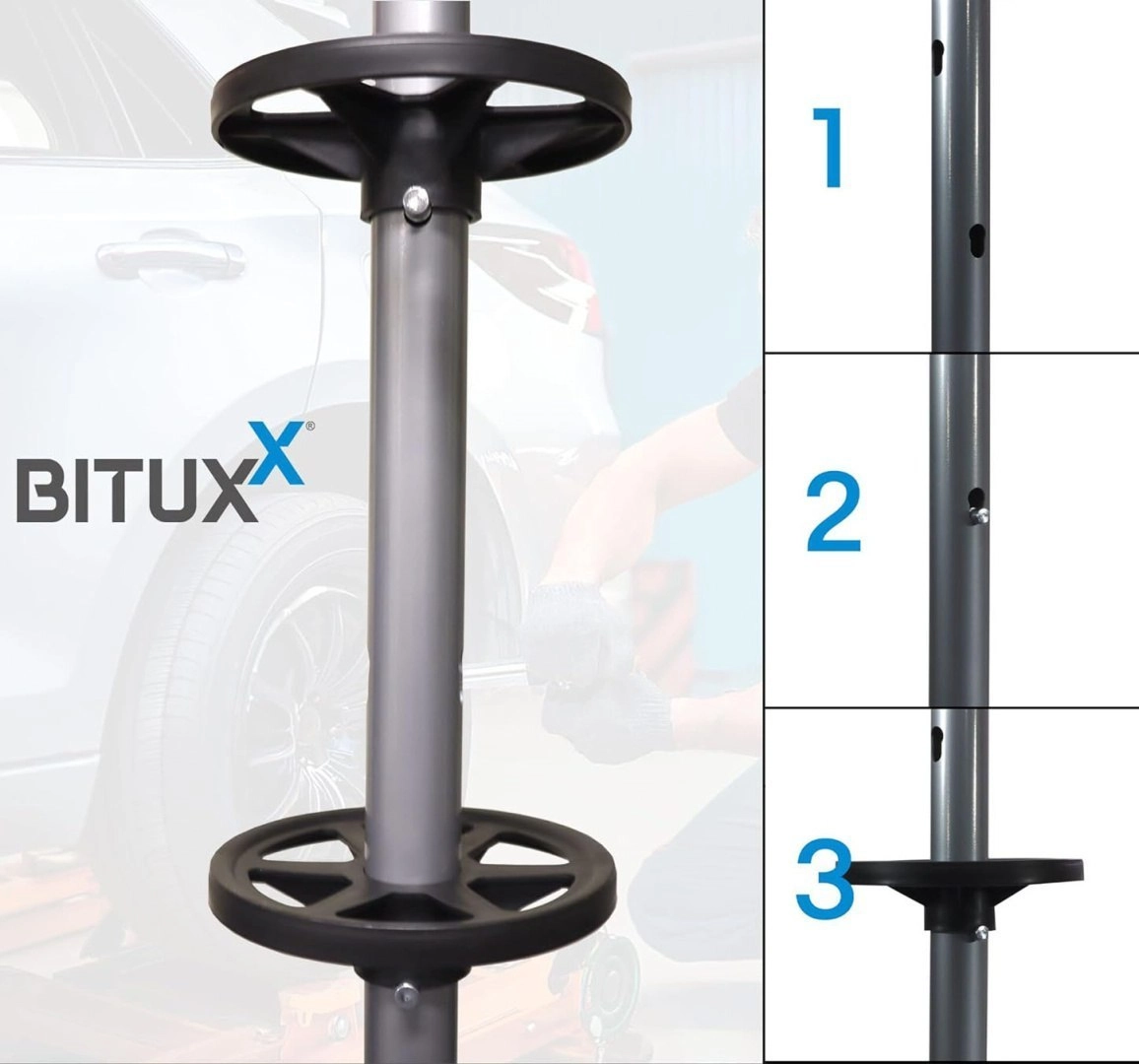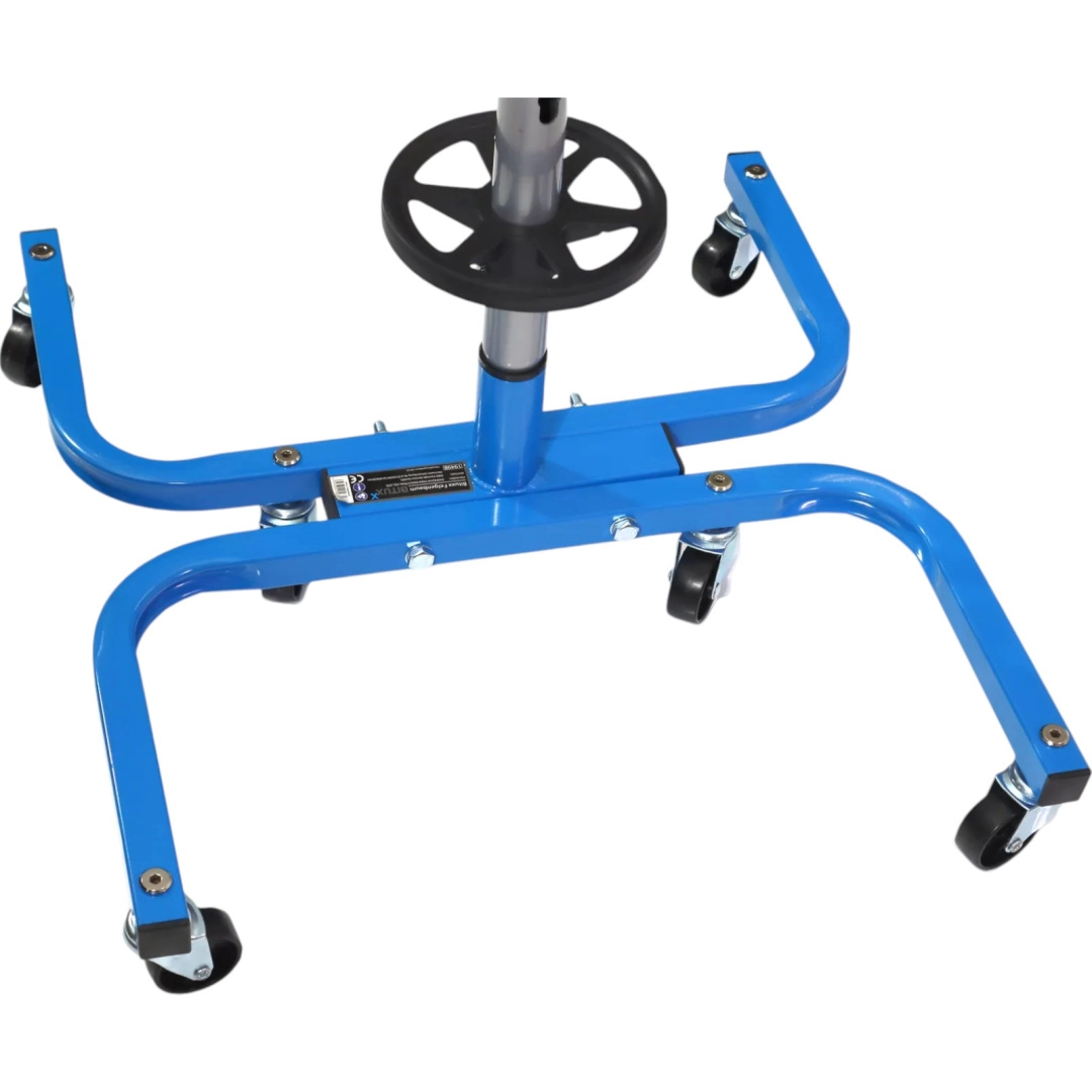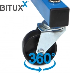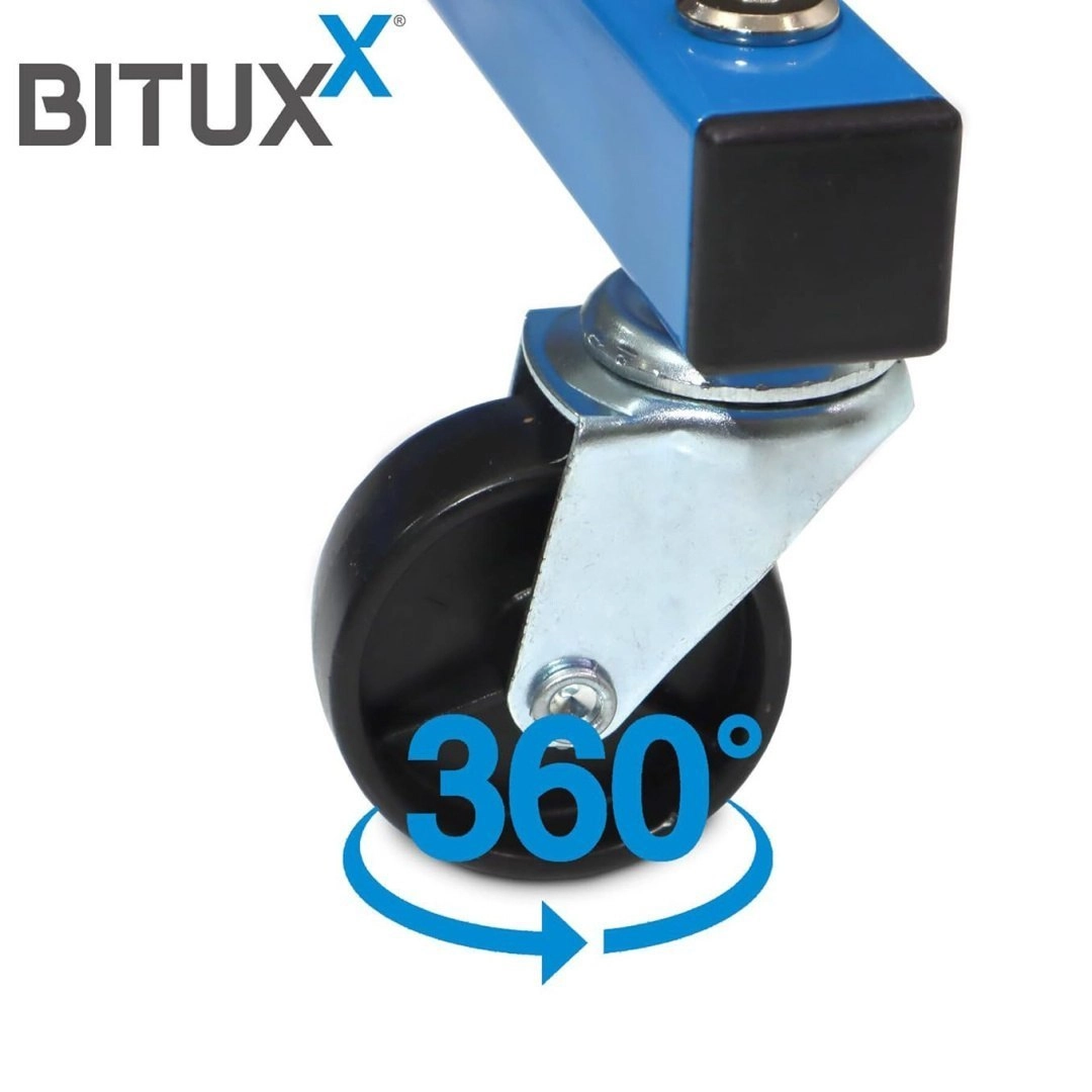 Dankzij de wielen verplaatst u de standaard eenvoudig in de garage of werkplaats, zelfs volledig beladen. Het ruimtebesparende ontwerp bespaart plaats en verhoogt het werkcomfort.